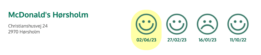 Imaginemos que estamos en enero de 2023 y queremos comer en el restaurante Mc Donald’s de la calle Christianshusvej 24 de Hørsholm y vemos que el emoticono muestra una cara enfadada, en el rótulo de la entrada como se ve en la imagen siguiente.