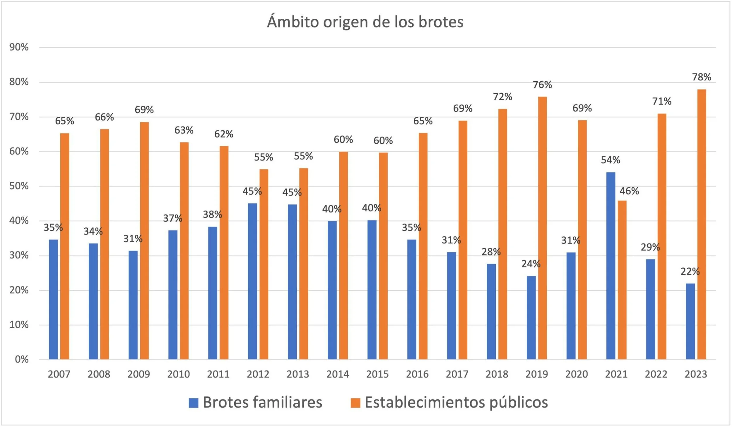 Porcentaje de brotes familiares en España en el periodo 2007 a 2023