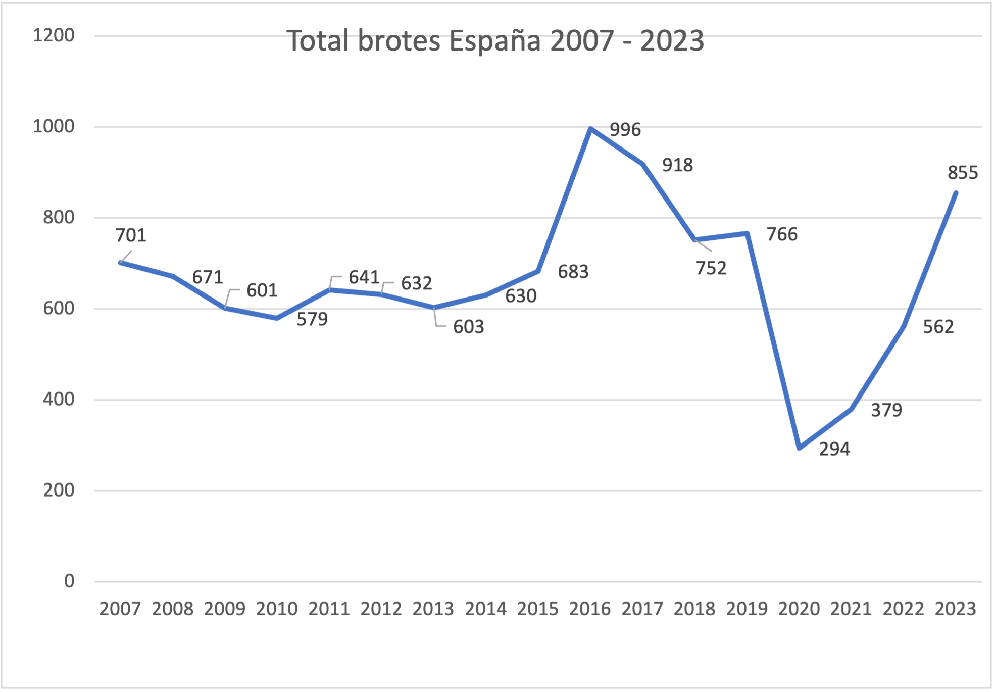 Total brotes intoxicaciones alimentarias en España de 2007 a 2023